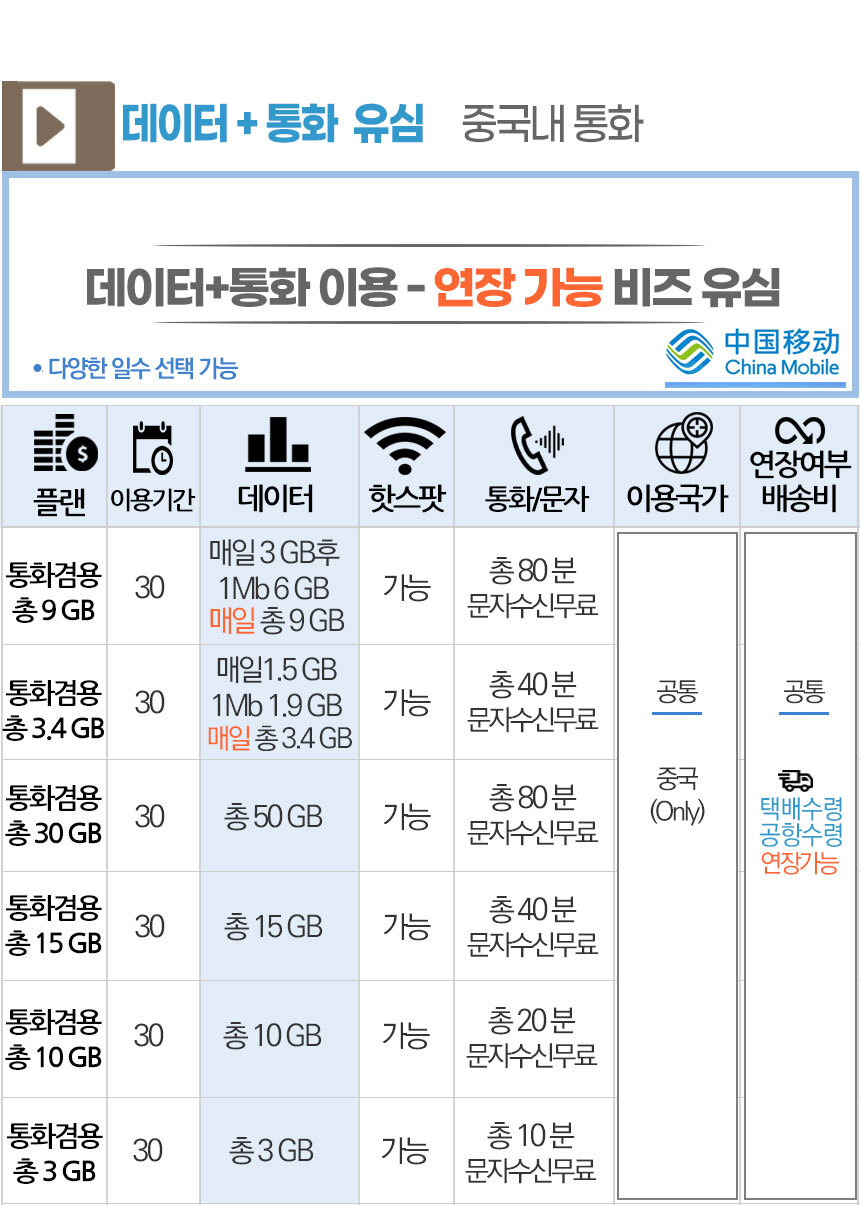 중국유심 중국 매일3기가 홍콩 마카오 매일3기가 비즈유심칩 핫스팟 지원