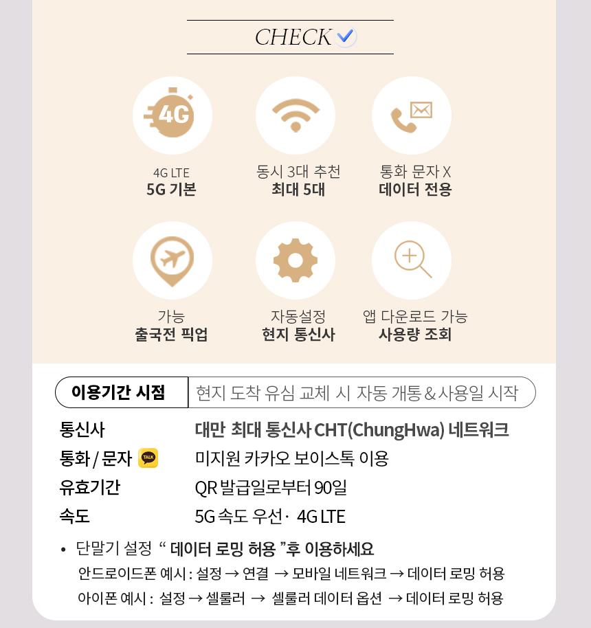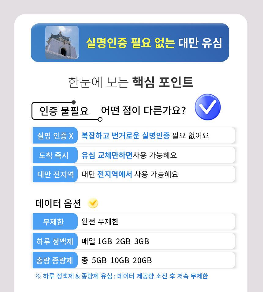 대만 유심칩 타이베이 가오슝 총용량제 총 5GB 10GB 20GB 무제한 핫스팟 중화텔레콤 심카드
